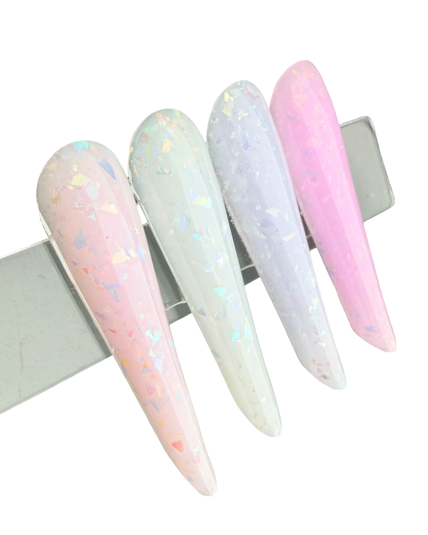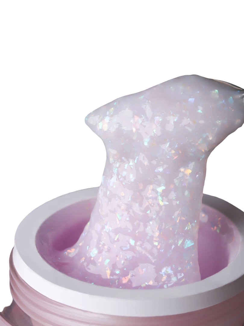 – много красивыхпрозрачно-переливающихсячастиц утопающих в молочной основе. За счёт насыщенности этими частицами гели густые и хрустальные; – средняя скорость выравнивания