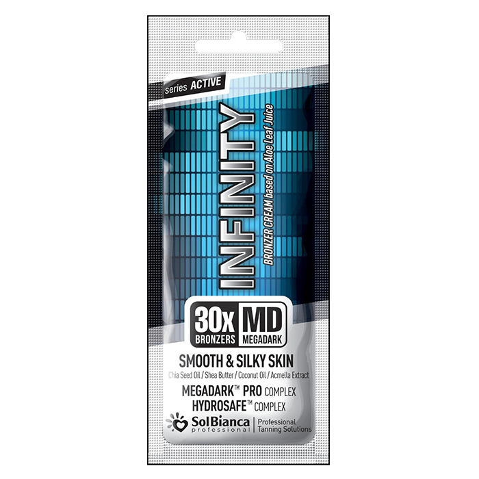 Профессиональный крем-релакс для загара в солярии SolBianca INFINITY, богатый биоактивными маслами, обеспечивает ровный глубокий оттенок загара, одновременно интенсивно ухаживает за кожей, питает и увлажняет, делая загар максимально комфортным. В основе крема сок алоэ вера и легендарный дуэт. Современный профессиональный автобронзер, комплекс-синергетик MEGADARK PRO, в который наряду с ДГА входит тирозин, редкое масло моринги, а также масло грецкого ореха и экстракт моркови. Комплекс сочетает в себе все 3 необходимых элемента - активаторы, корректоры и пролонгаторы загара, работающие в т.ч. на усиление выработки собственного меланина. Итоговый результат зависит непосредственно от базового оттенка кожи и будет хорошо заметен уже через 3 часа после сеанса.
