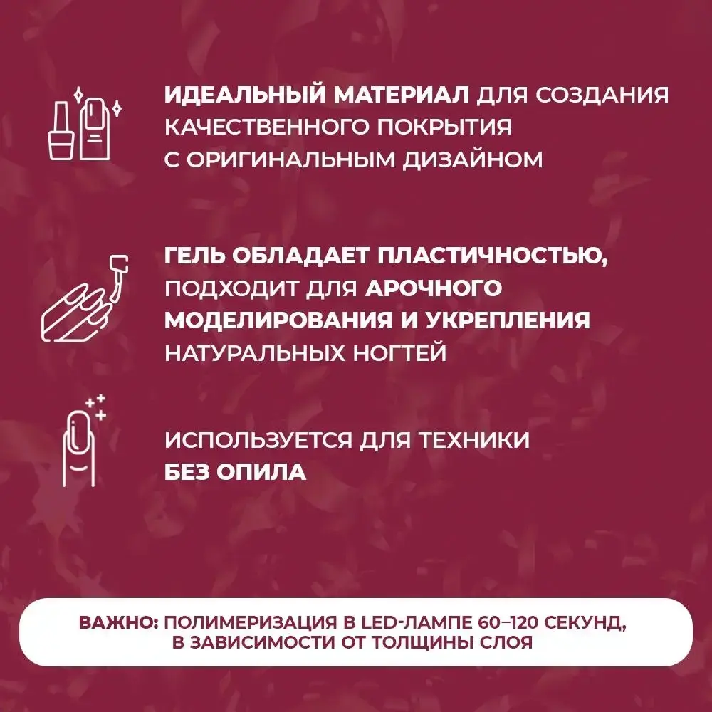 Важно: полимеризация в LED-лампе 60-120 секунд, в зависимости от толщины слоя.